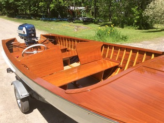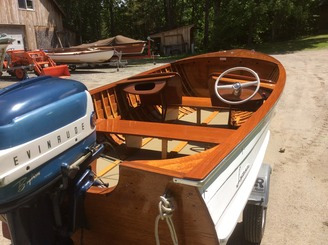 Rear steer walk through, restored by us in 2008, Then the boat was completely re ribbed, new decks gunwales and complete refinish. The boat has been used very little since. We now have the boat back and have gone over it. We gave it 3 coats of fresh varnish, fresh paint. The Engine is a pristine 1958 35hp Evinrude Runs like a top.