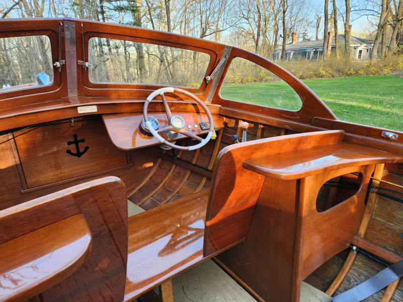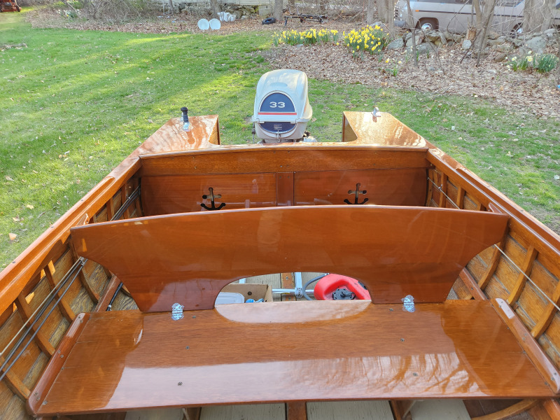 1960 16.5′ Lyman – restored in our shop in 2000 for its present owners. it returned for fresh paint and varnish in 2019. This boat has been lovingly cared for for the past 23 year but it is now time to pass on the stewardship batton. Powered by a 1967 33HP Evinrude which has not been started in a few years. This boat is in excellent structural shape. The interior is ready for some light sanding and varnish. The seats, decks, and transom were done in 2019 as were the topsides and bottom.